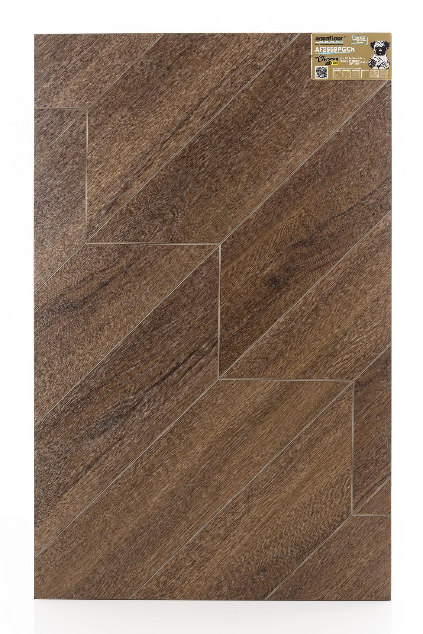 Виниловый ламинат Aquafloor AF2559PGCh - цена 3 250 руб. за квадратный метр. Это покрытие толщиной 2,5 мм, порода дерева - дуб, фаска с 4-х сторон. Брашированная поверхность винилового пола имеет тёмный оттенок и матовый блеск. Для того, чтобы купить в Казани виниловый ламинат из коллекции Aquafloor Parquet Chevron Glue AF2559PGCh, положите товар в корзину или свяжитесь с нами любым доступным способом. Товар есть в наличии.