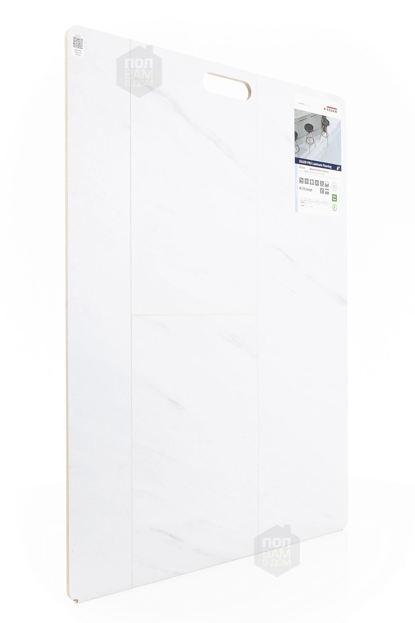 Ламинат EGGER Мрамор Леванто белый EPL245 - цена 1 850 руб. за квадратный метр. Это покрытие толщиной 8 мм, фаска с 4-х сторон. Брашированная поверхность ламината имеет светлый оттенок и матовый блеск. Для того, чтобы купить в Казани ламинат из коллекции EGGER Large 8/33 Aqua+ Мрамор Леванто белый EPL245, положите товар в корзину или свяжитесь с нами любым доступным способом. Товар есть в наличии.
