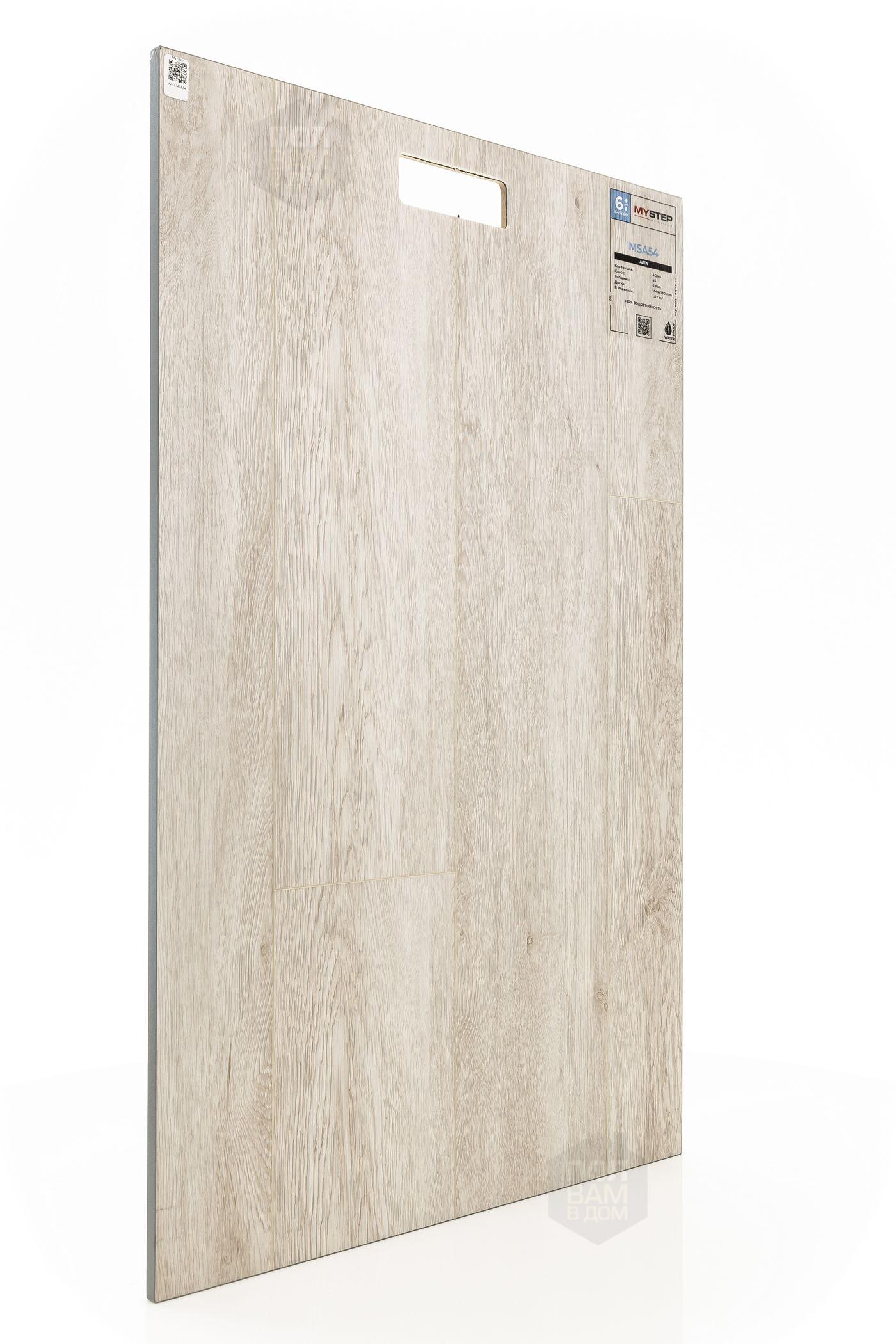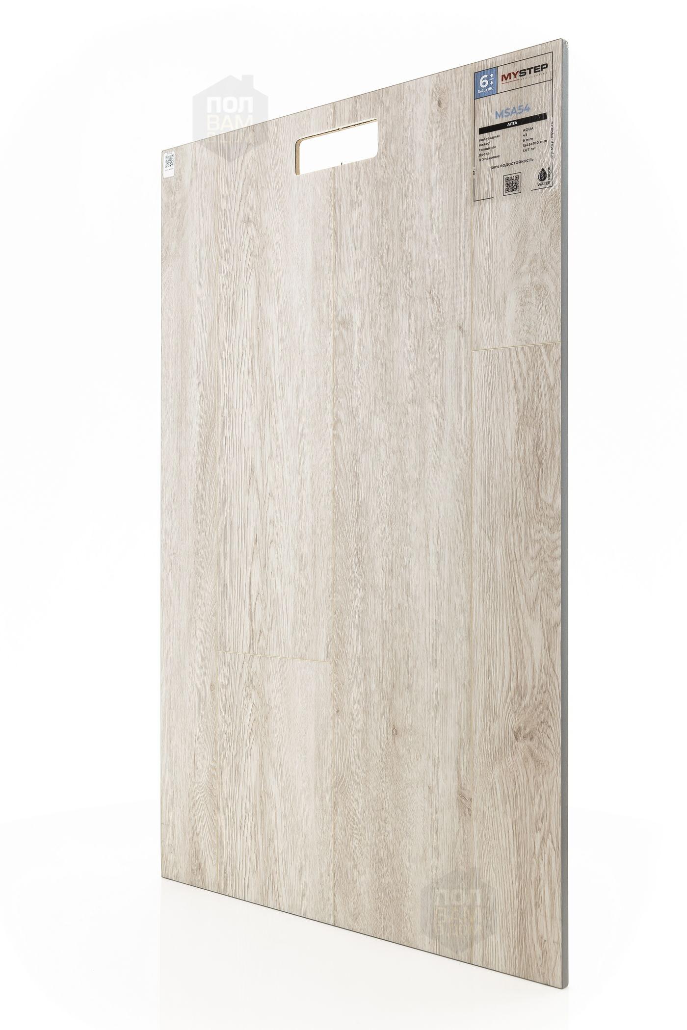 SPC ламинат My Step Алта MSA54 - цена 3 290 руб. за квадратный метр. Это покрытие толщиной 6 мм, порода дерева - дуб, фаска с 4-х сторон. Тиснение поверхность SPC ламината имеет светлый оттенок и матовый блеск. Для того, чтобы купить в Казани SPC ламинат из коллекции My Step Аква 6мм Алта MSA54, положите товар в корзину или свяжитесь с нами любым доступным способом. Товар есть в наличии.