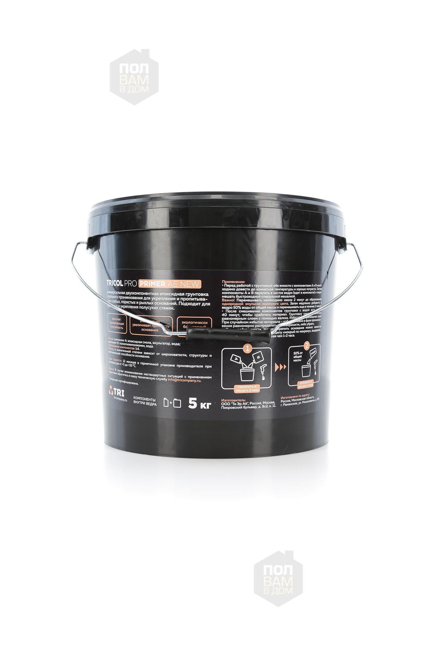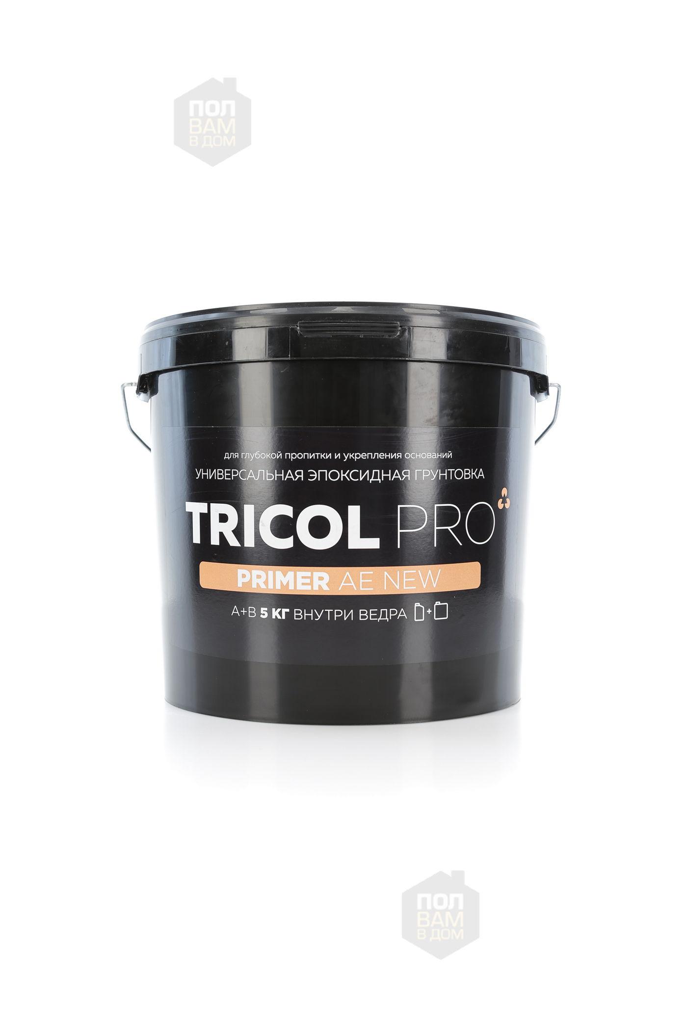 Грунт-праймер TRICOL PRO PRIMER AE NEW - Эпоксидная грунтовка для глубокой пропитки и укрепления рыхлых, слабых оснований. Применяется для подготовки бетонных, деревянных, металлических и прочих оснований при укладке различных напольных покрытий для увеличения прочности этих оснований и улучшения адгезии клея к ним. Подходит для пропитки и укрепления полусухих стяжек.